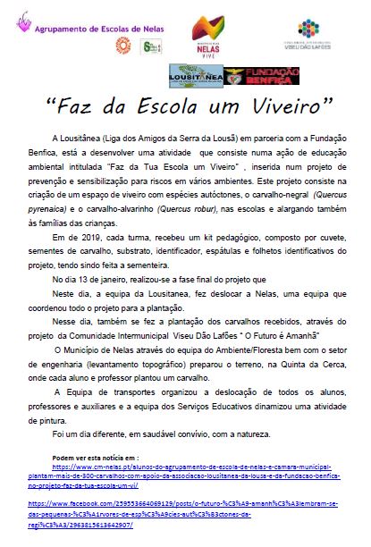 A Lousitânea (Liga dos Amigos da Serra da Lousã) em parceria com a Fundação Benfica, está a desenvolver uma atividade  que consiste numa ação de educação ambiental intitulada "Faz da Tua Escola um Viveiro” , inserida num projeto de prevenção e sensibilização para riscos em vários ambientes. Este projeto consiste na criação de um espaço de viveiro com espécies autóctones, o carvalho-negral  (Quercus pyrenaica) e o carvalho-alvarinho (Quercus robur), nas escolas e alargando também às famílias das crianças.