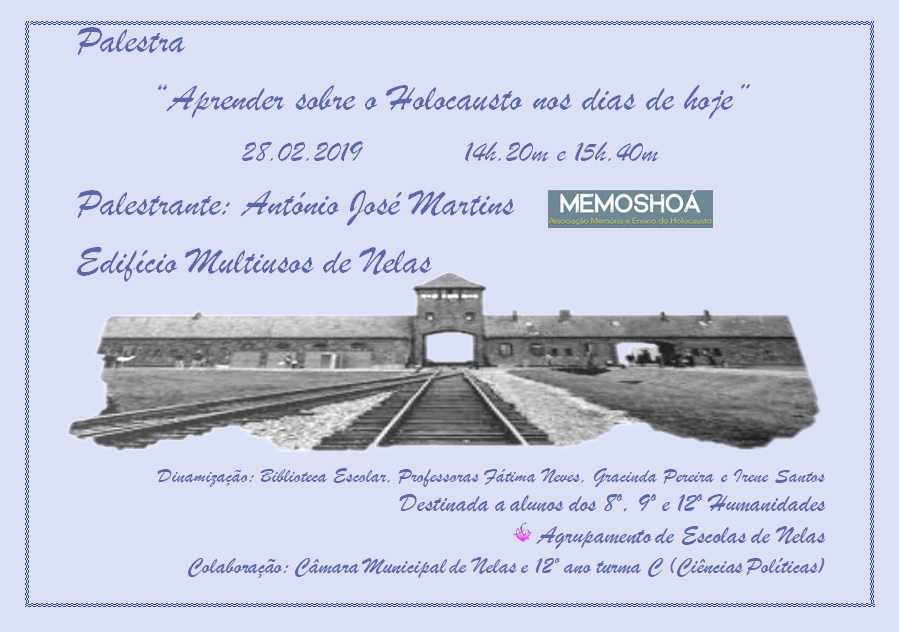Na sequência do Dia Internacional das Vítimas do Holocausto que se comemora a 27 de janeiro, vai realizar-se a 28 de fevereiro a palestra “Aprender sobre o Holocausto nos dias de hoje” com o Dr. António José Martins, formador da Memoshoa, Associação Memória e Ensino do Holocausto, no auditório do Multiusos de Nelas. A palestra tem como objetivo o desenvolvimento do trabalho de educação e memória do Holocausto, com especial incidência no meio escolar. É dinamizada pela Biblioteca Escolar e pelas docentes Fátima Neves, Gracinda Pereira e Irene Santos.